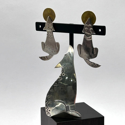 Vintage Taxco Mexico Coyote Brooch & Stud Earrings 925 Sterling Silver