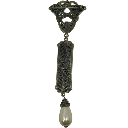 Heidi Daus Art Deco Bronze Tone White Crystal Pin Brooch Dangling Faux Pearl