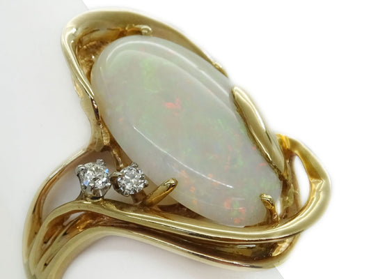 Natural Fire Opal & Old European Diamond Ring 14k Gold Size 6.5