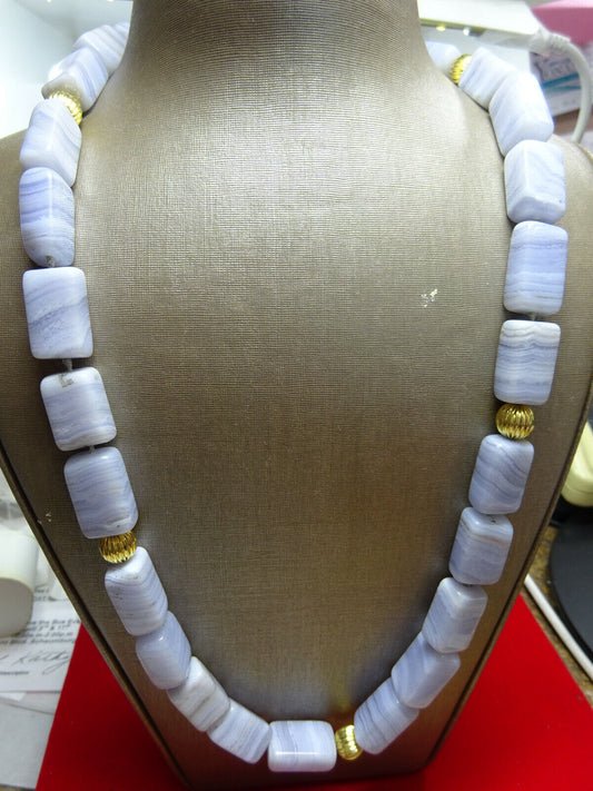 Natural Blue Lace Agate & 14k Yellow Gold Bead Necklace 36" Long