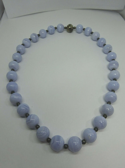 12mm Wide Blue Lace Agate Sterling Silver Bead Necklace 18" Long Magnetic Clasp