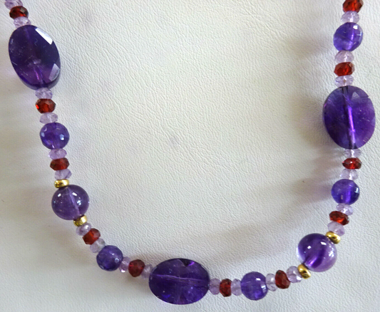 Zoe B. Designer Signed 14K Gold, Amethyst & Garnet Bead Necklace 34", Extra Long