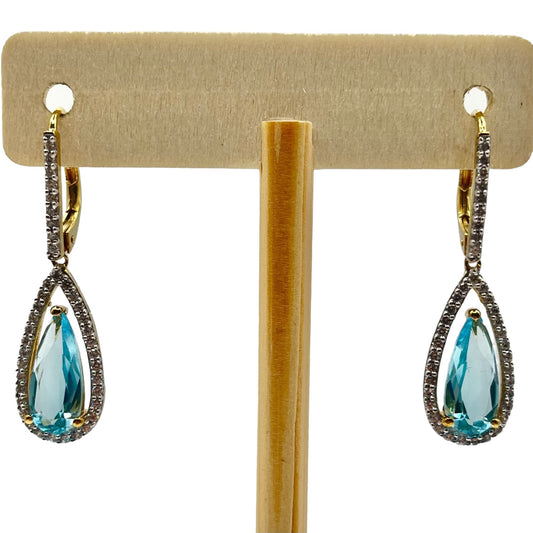 925 Sterling Silver Gold Layered Blue Topaz Dangle Drop Earrings CZ Accents