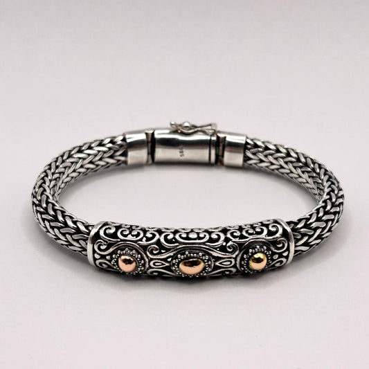 925 Sterling Silver Naga Chain Bracelet - Bali Engraving & Gold Tone Dots 68.5g