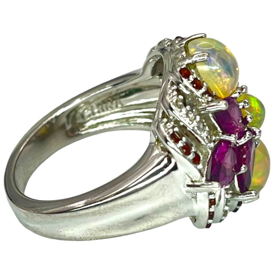 925 Sterling Silver Opal Garnet Topaz Size 8 Ring Cocktail Statement Colorful