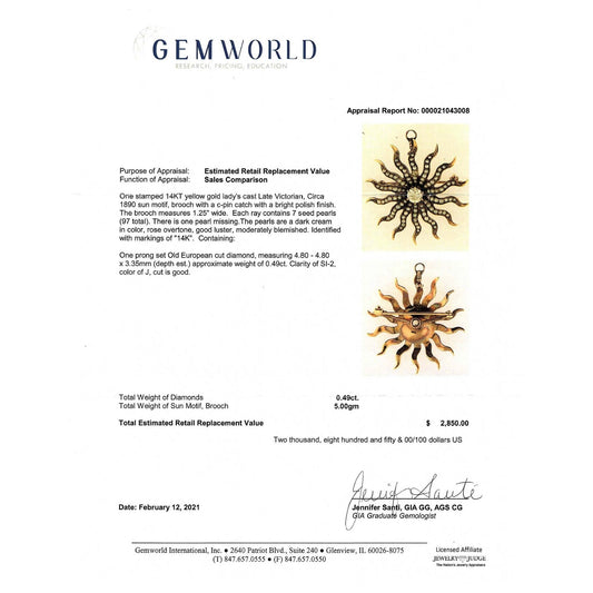 Antique Victorian Old Euro Diamond & Seed Pearl Sun Brooch Pendant 14k Gold