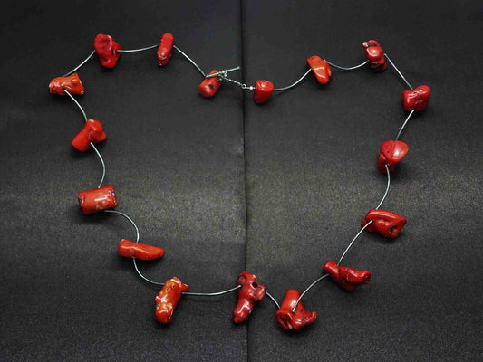 Antique Oxblood Fire Red Coral Chunky Nugget & Sterling Silver Necklace 31"