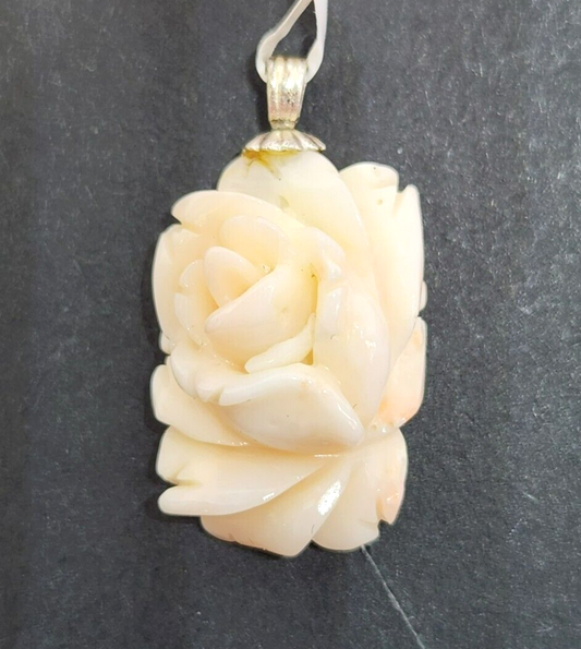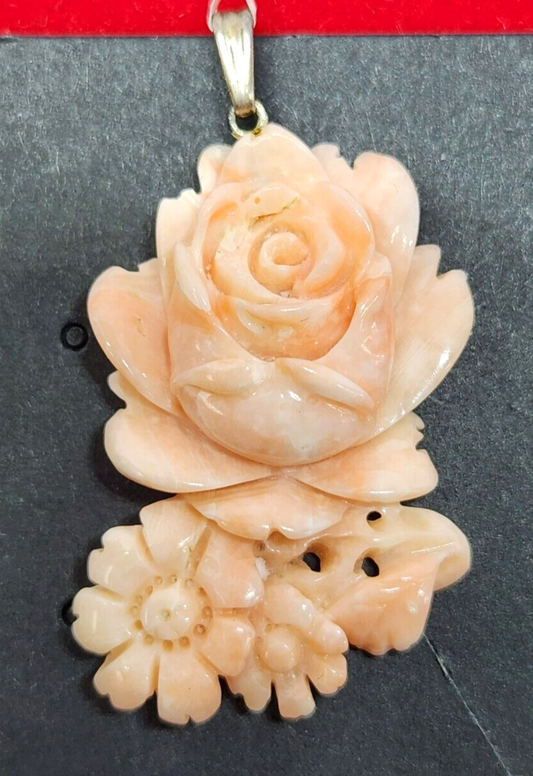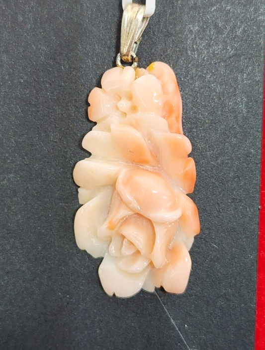 Carved Floral Angel Skin Coral Sterling Silver Pendant 1.5" Long