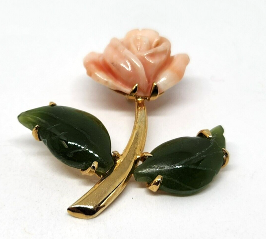 Carved Angel Skin Coral Rose Flower Nephrite Petals Gold Filled Pendant