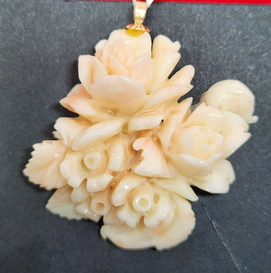 Carved Floral Angel Skin Coral 14k Gold Pendant 2.5" Long
