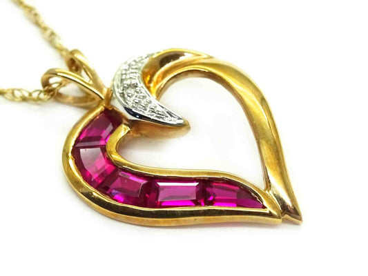 CZ & Natural Ruby Heart Half Charm Pendant Necklace 10k Gold