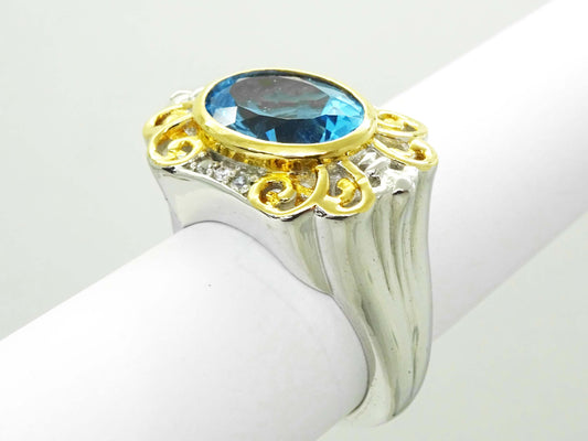 Faceted Blue Topaz & CZ Accent Statement Ring Sterling Silver Size 10