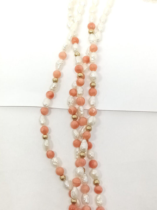 Freshwater Pearl and Coral 14k Yellow Gold 4 Strand Bead Necklace + Bonus