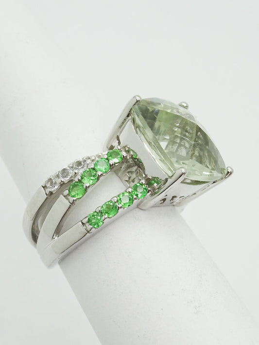 Fantasy Cushion CZ Green & White Sterling Silver Filigree Ring Size 5