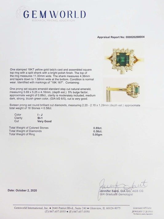 1.47ct tw Square Natural Emerald & Diamond Halo Ring 18k Gold Size 7.25