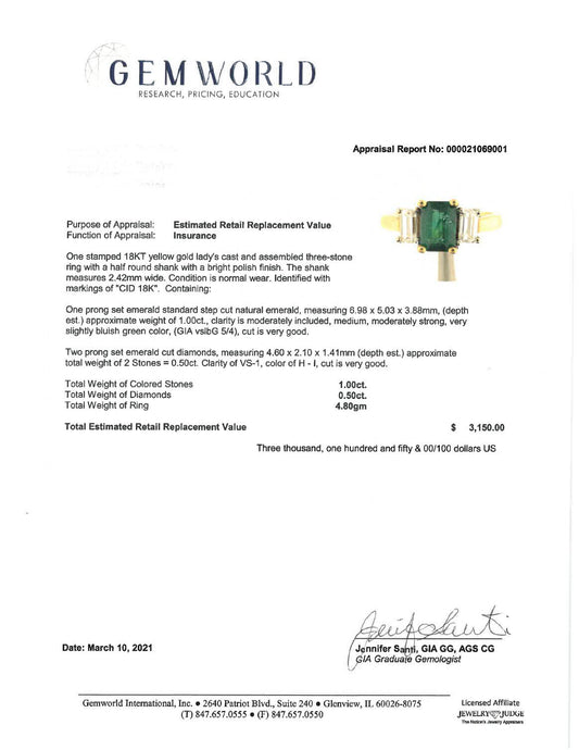 1.50ct tw Natural Emerald & Diamond Accent 3-Stone Ring 18k Gold Size 7