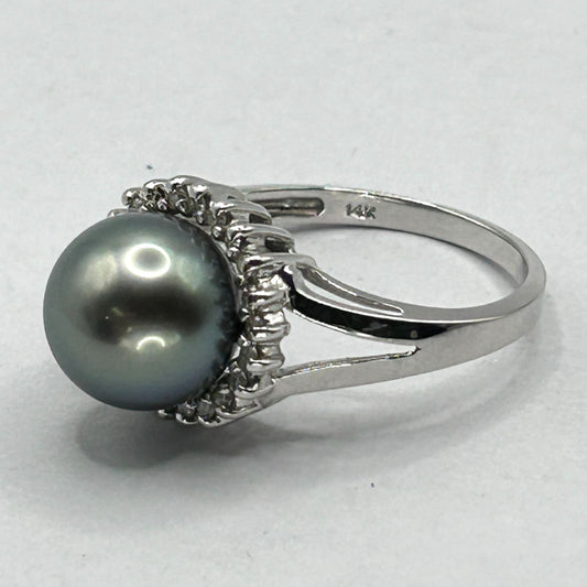 14k White Gold 10-10.5mm Tahitian Black Pearl and Round Diamonds Ring Size 7.5