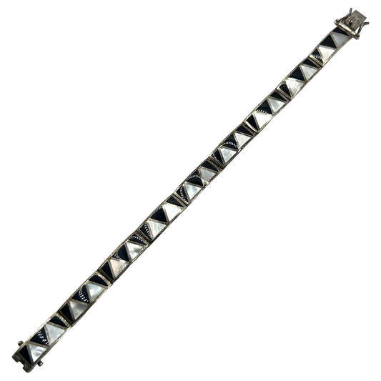 Vintage Sterling Silver Black Onyx & Mother of Pearl Inlay Link Panel Bracelet