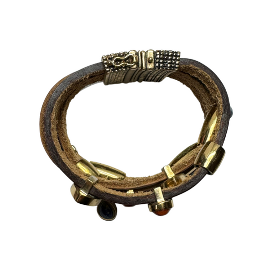 Signed Barse Thai 5 Brown Leather 7 Stone Gold Metal Magnetic Bracelet