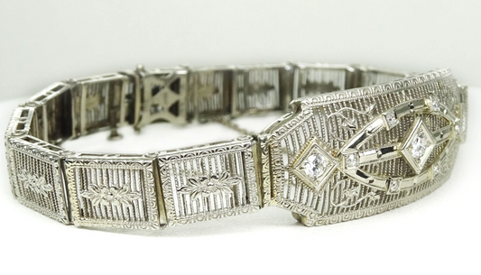 Vintage Art Deco 14k White Gold Diamond Station Bracelet