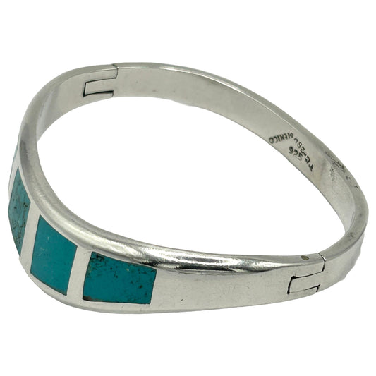 Vintage Taxco Mexico Sterling Silver Turquoise Inlaid Modernist Bangle Bracelet
