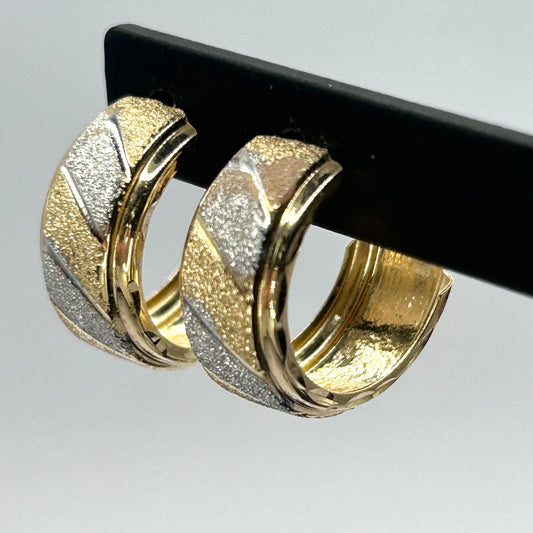 14k Two-Tone Huggie Diamond Cut Textured Hoop Earrings
