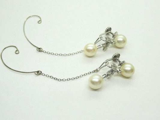 Akoya Pearl & Colorless DIAMOND Dangle Earrings SOLID 14K WHITE GOLD w/Ear Hooks
