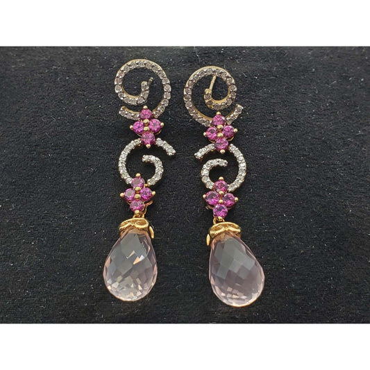 Rose Quartz Pink Tourmaline & Diamond Dangle Drop Earrings 10k Gold