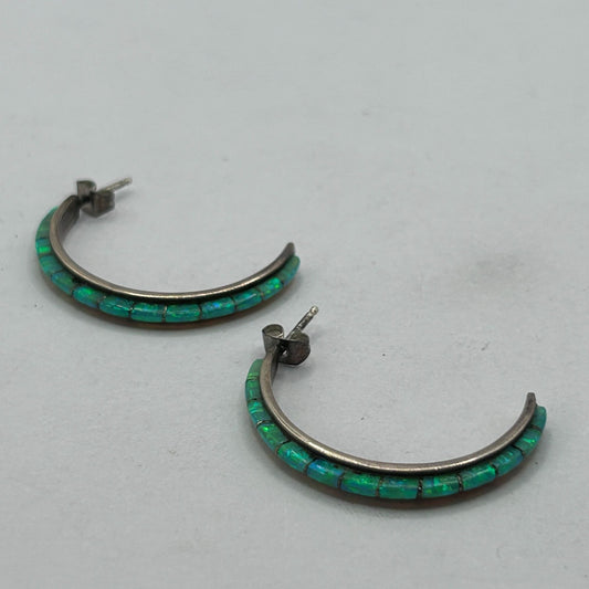 Vintage Green Fire Opal Inlay Half Hoop Earrings 925 Sterling Silver