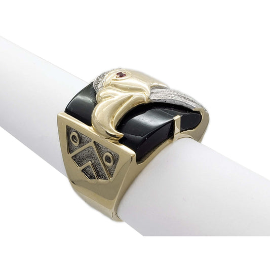 Natural Onyx Diamond & Garnet Eagle Cigar Band Ring Two-Tone 14k Gold Size 9.75