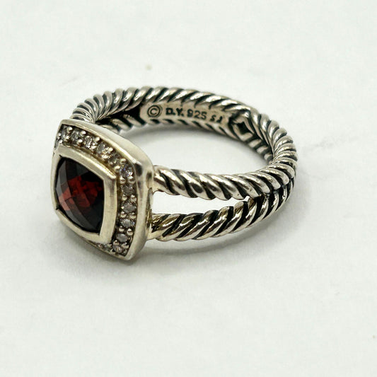 David Yurman Petite Albion Ring Sterling Silver with Garnet and Diamonds, Size 7