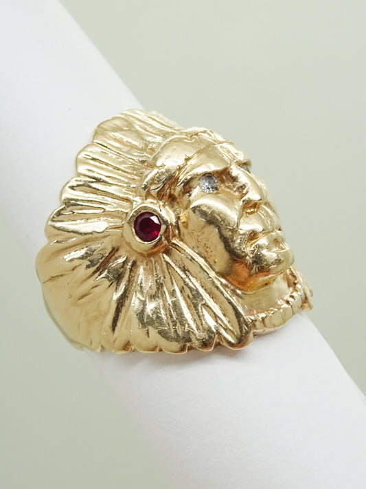 Native American Indian Chieftain Head Garnet & Diamond Ring 14k Gold Size 9.25