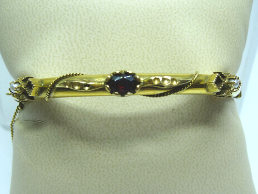 Vintage 14k .50CTW Garnet & Seed Pearl Hinged Bangle Bracelet, Safety Chain