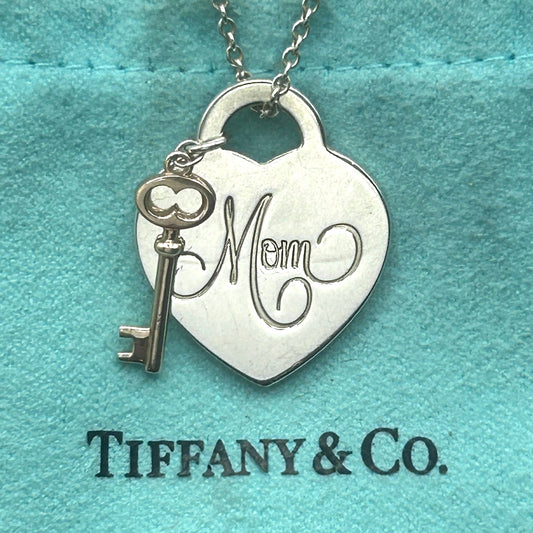 Tiffany & Co. 925 Sterling Silver 'Mom' Heart Pendant w Key 18" Necklace