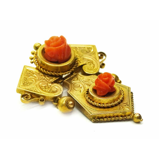Victorian Hinged Carved Rose Red Coral Lavalier Brooch Pendant 16k Gold