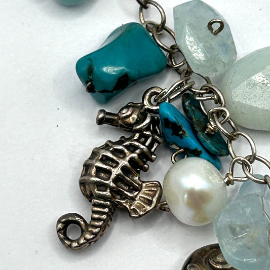 Sajen Aquamarine, Turquoise & Pearl Sterling Silver Necklace w Sea Animal Charms