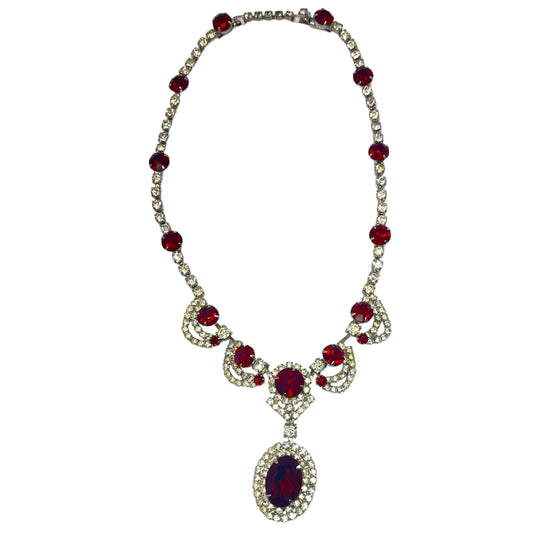 Vintage Kramer of New York Necklace Red Rhinestone Pendant Drop Formal Statement
