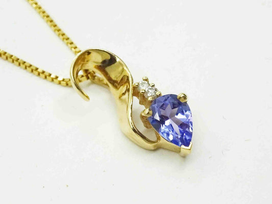 Natural Pear Tanzanite & Diamond Ribbon Style Pendant Necklace 14k Gold