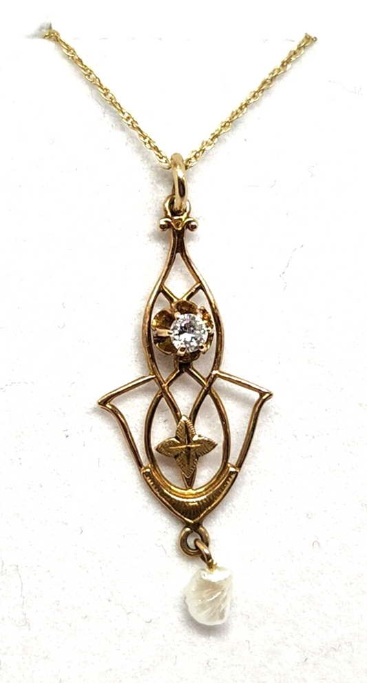 Victorian Lavalier 0.1ct Diamond & Seed Pearl 10k Gold Pendant, 18'' Long