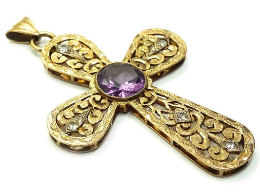 Synthetic Alexandrite & Natural Diamond Rounded Filigree Cross Pendant 14k Gold