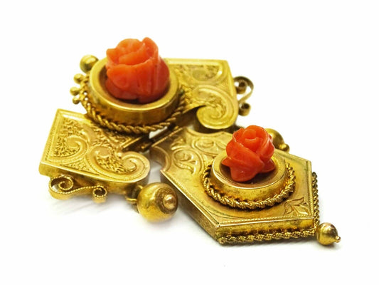 Victorian Hinged Carved Rose Red Coral Lavalier Brooch Pendant 16k Gold