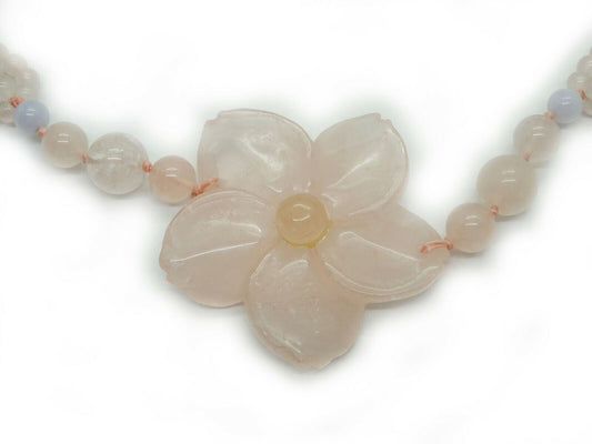 Pink Carved Flower Rose Quartz Bead Necklace 32"