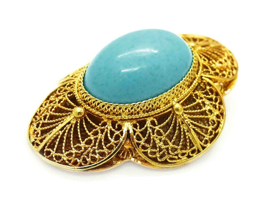 Natural Robin's Egg Blue Oval Turquoise Cabochon Filigree Pendant 14k Gold
