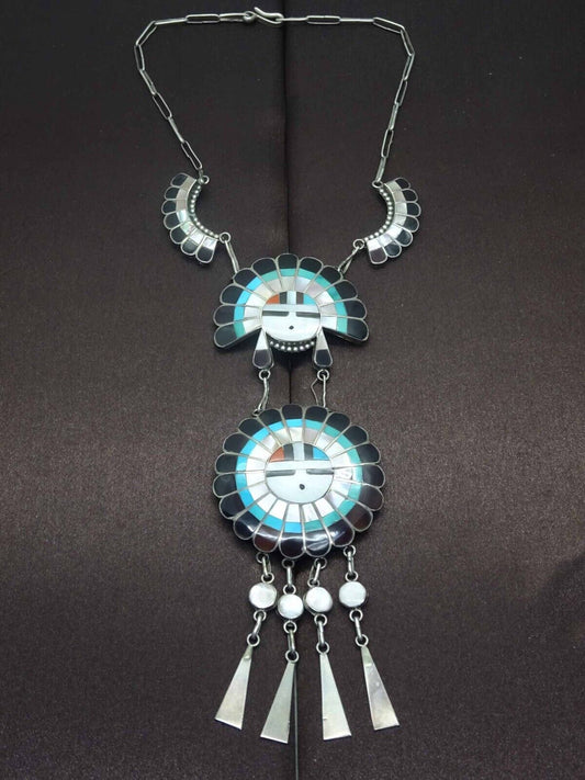 J.D. Massie Inlay Turquoise Coral Jet Mother-of-Pearl Zuni Sun God Necklace