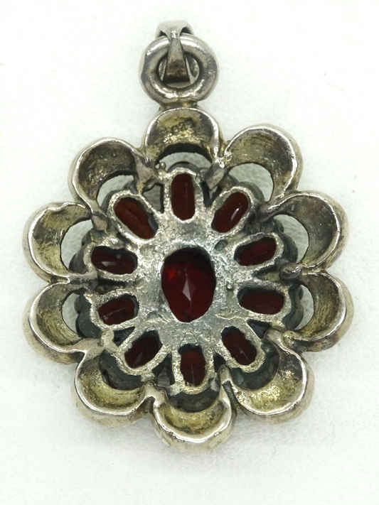 Vintage Garnet & Marcasite Cluster Sterling Silver Flower Burst Pendant