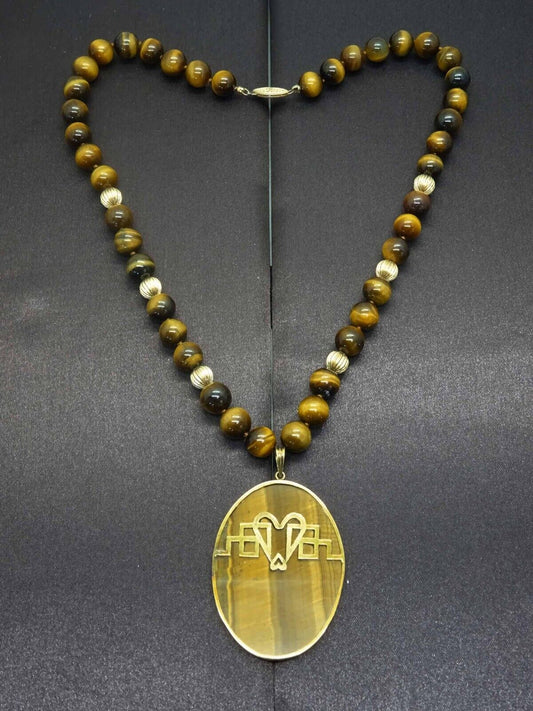 Vintage Tiger's Eye & 14k Gold Bead Pendant Necklace 10k Gold Clasp 20" Long
