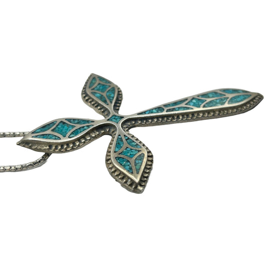 Native American 925 Sterling Silver Turquoise Chip Inlay Cross Pendant Necklace