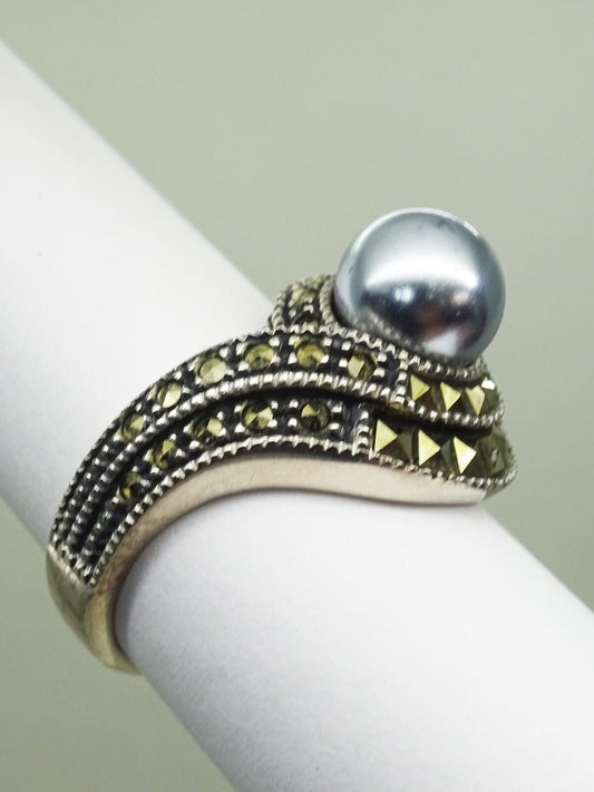 Judith Jack Sterling Silver Marcasite Gray Faux Pearl Ring Size 6.25