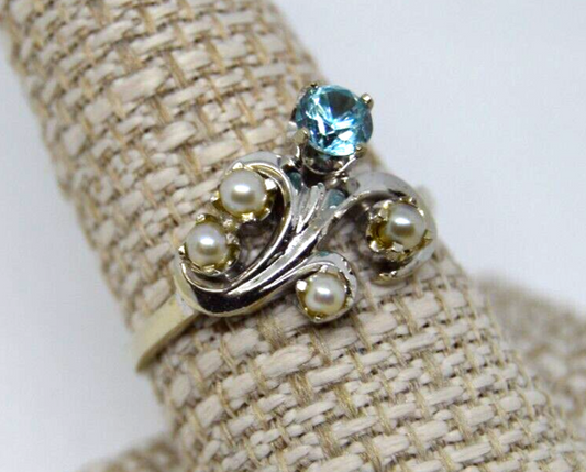 Vintage Blue Zircon & Pearl 14k White Gold Band Ring, Size 10