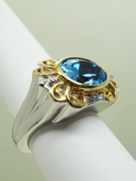 Oval Faceted Blue Topaz & CZ 2-Tone Sterling Silver Ring Size 10